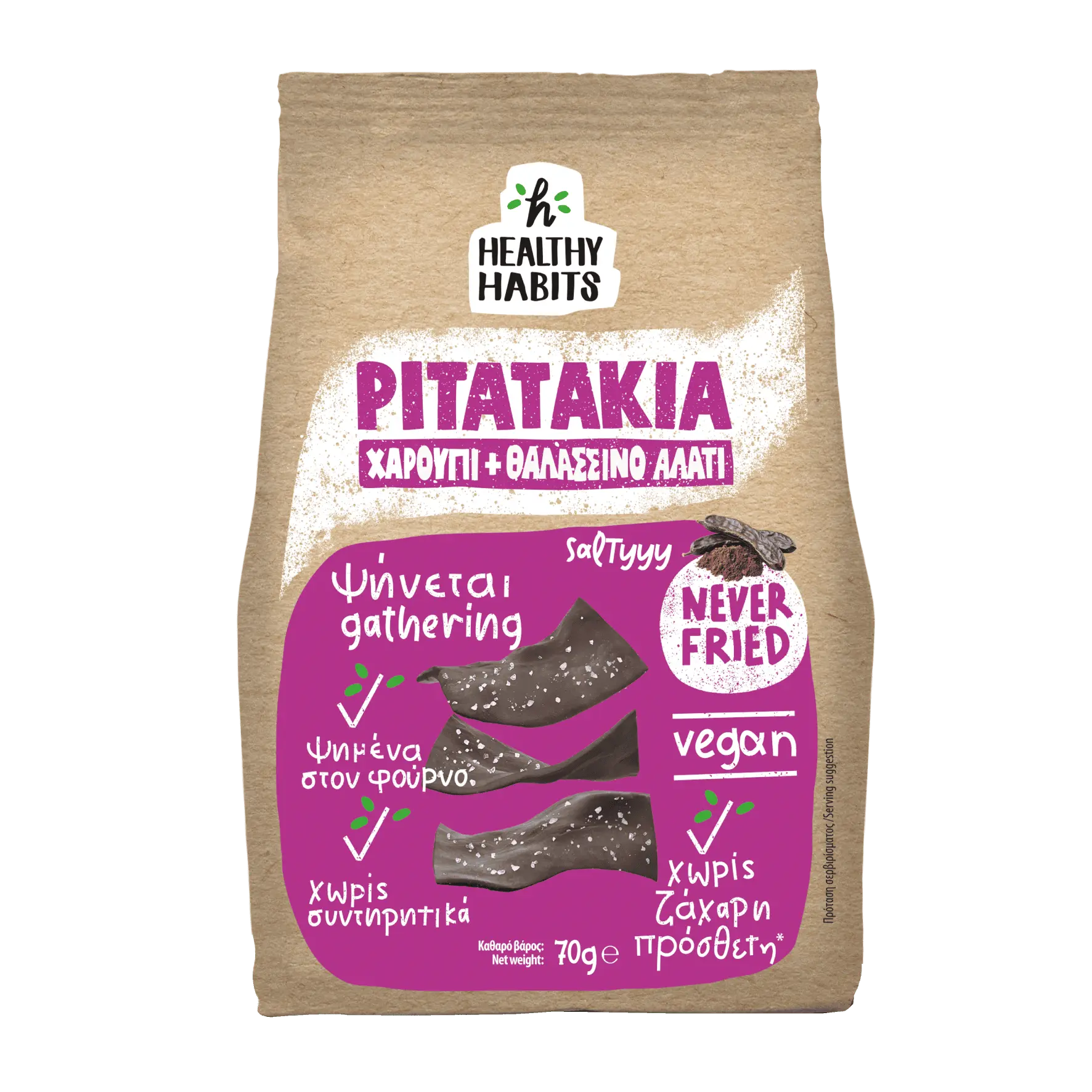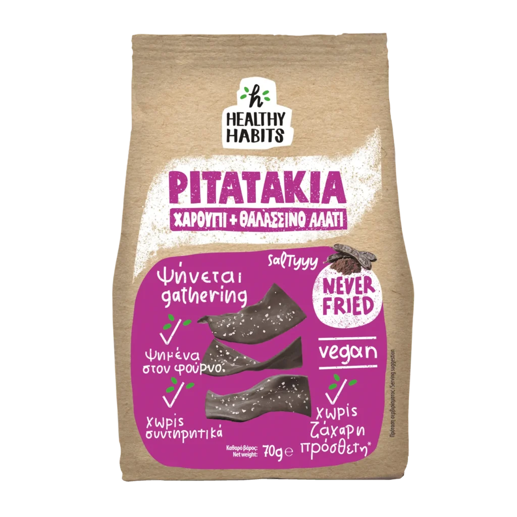 Μόνο με αλεύρι σίτου, χαρούπι, ελαιόλαδο, ηλιέλαιο, ελαιόλαδο, μαγιά και θαλασσινό αλάτι. Never fried!